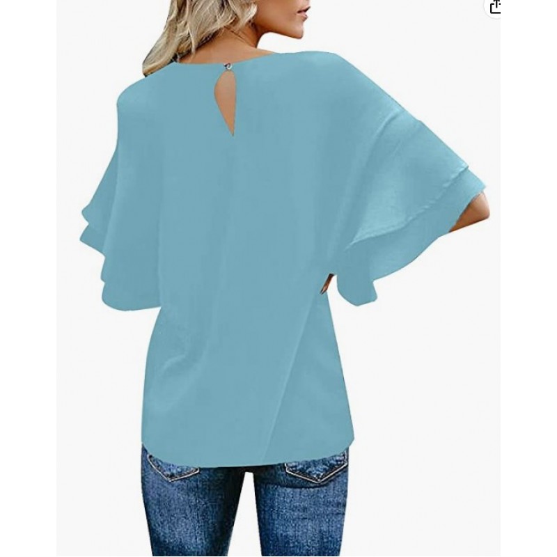 • Women casual blouse, round neck blouses for women, casual outfits for women, women tops for work. This loose blouse shirt features 3/4 tiered ruffle bell sleeves. Solid beige, black or navy blue color, etc.