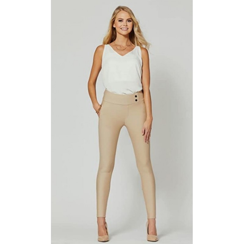 Slim Leg With Buttons - Beige Nude Women's Stretch Dress Pants - Wear to Work - Ponte Treggings